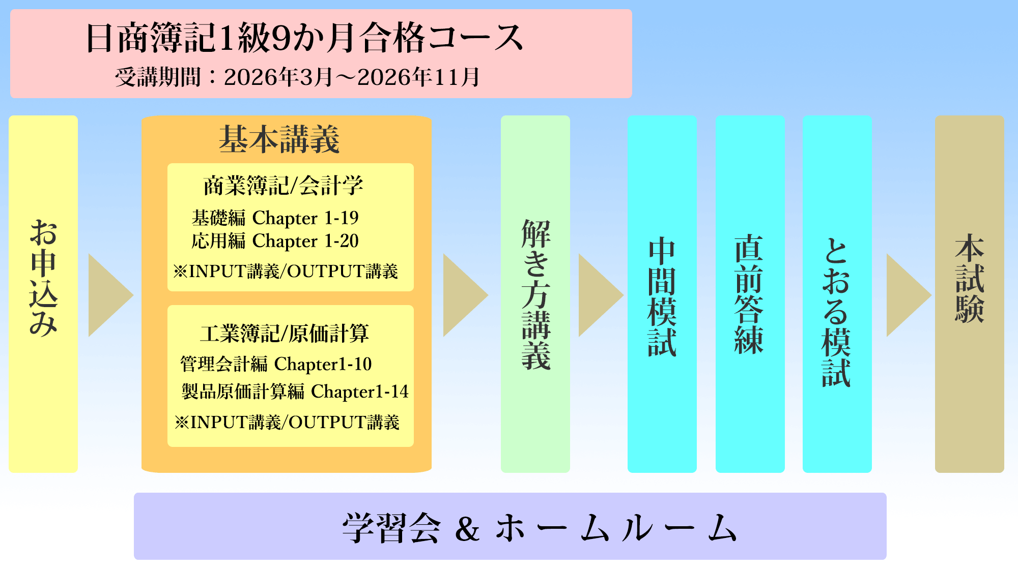 日商簿記1級の内容を3月からの9か月間で基礎から試験対策まで一環して学習するコースです。