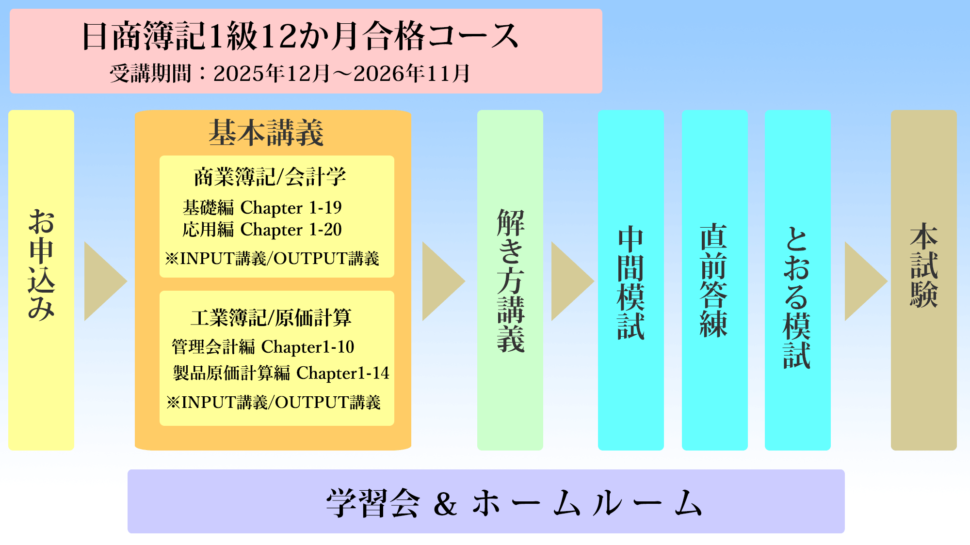 日商簿記1級12か月合格コースは25年12月~26年11月の約1年間で日商簿記1級を目指すコースです。